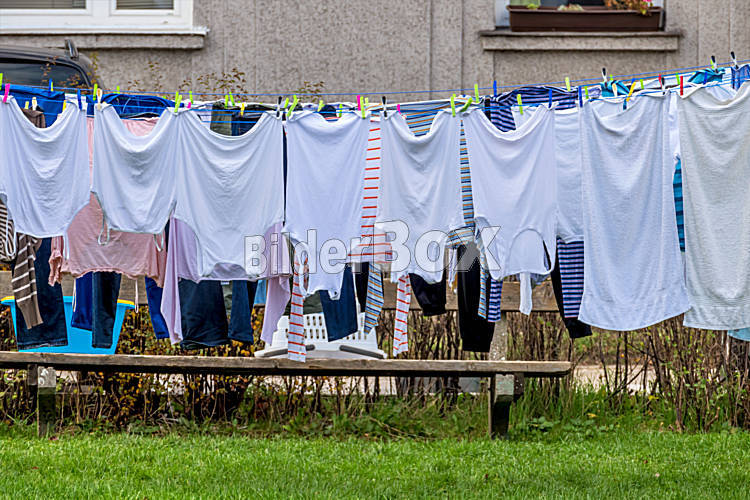 Beschreibung Auf einem Wäscheständer hängen Kleidungsstücke zum Trocknen. Waschtag