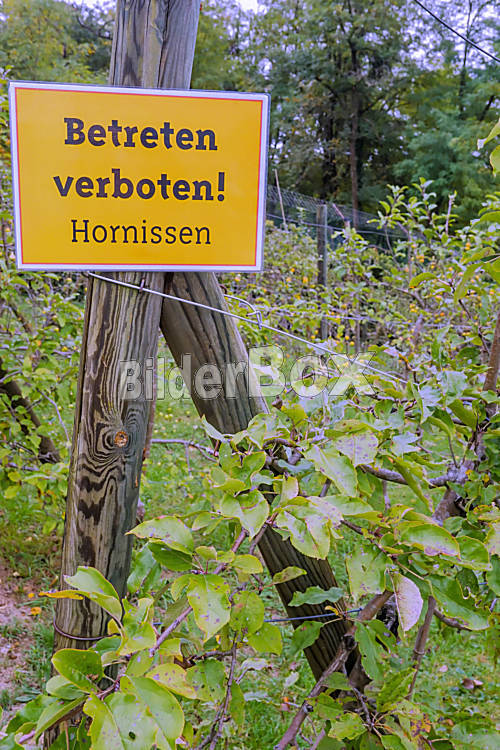 Beschreibung Auf einem Schild wird vor Hornissen gewarnt