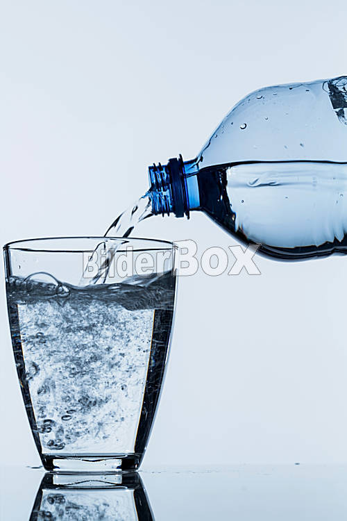Beschreibung Aus einer Wasserflasche wird Wasser in ein Glas gegossen