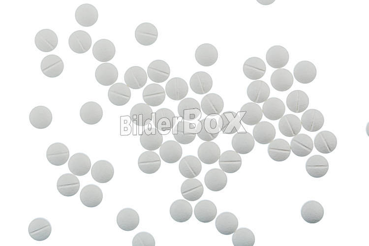 Beschreibung Weiße Tabletten, Symbolfoto für Medizin, Heilmittel und Tablettensucht