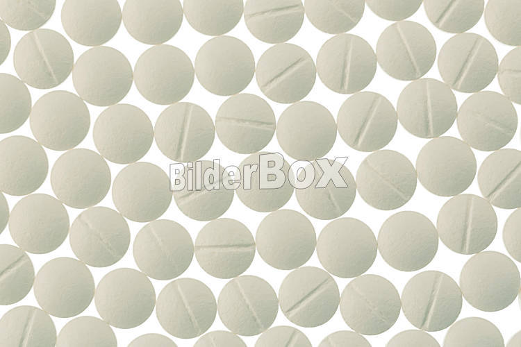 Beschreibung Weiße Tabletten, Symbolfoto für Medizin, Heilmittel und Tablettensucht