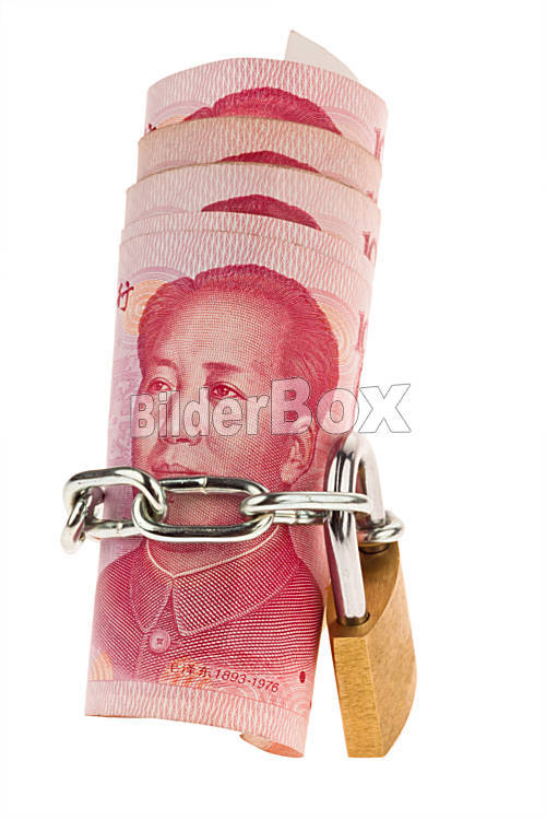 Beschreibung Ein chinesischer Yuan geldschein mit einem Schloss verschlossen. Sicherheit bei der Geldanlage