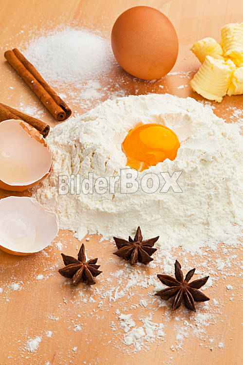 Beschreibung Zutaten zum backen von Weihnachtsbäckerei. Backen von Plätzchen im Advent.