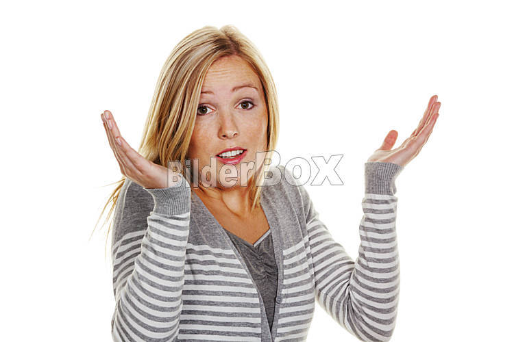 ahnungslose Frau zuckt mit den Schultern